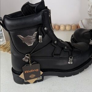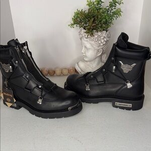 Bold black boots with striking silver details. Rugged design for adventurous spirits. Iconic Harley-Davidson style. • Full Grain Leather Upper With An Oil-Resistant Rubber Outsole