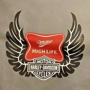 HARLEY-DAVIDSON MOTORCYCLES & MILLER HIGH LIFE BEER GRAY DRAWSTRING CLOSE FABRIC BAG / TOTE
