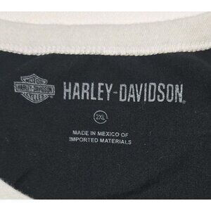 Features a solid black color with a ringer trim and graphic print of an eagle wearing sunglasses and the Harley-Davidson logo
