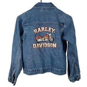 This Harley Davidson Motorcycle denim jacket is perfect for your little biker! It's in excellent preowned condition from a smoke-free home and is a size 12/14.