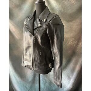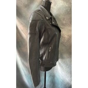 Keywords: Harley Davidson, leather jacket, motorcycle jacket, biker jacket, women's jacket, riding jacket, black leather jacket, Harley Davidson women's, small leather jacket, moto jacket, asymmetrical jacket, preowned jacket, leather outerweaR