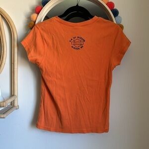 Orange shirt with black embroidered logo at chest