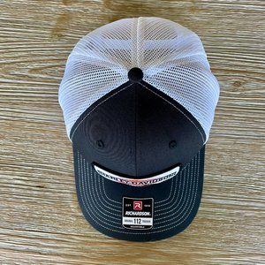 Vintage Harley Davidson Motorcycles patch professionally applied to a brand new black & white Richardson 112 cap.