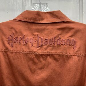 Harley Davidson Motorcycles rust terracotta button down shirt women's medium embroidered logo front and back. hidden front buttons. can choose to have buttons showing or hide the buttons. sleeves can roll up or be left down. pit to pit is 21.5 and shoulder to hem is 24