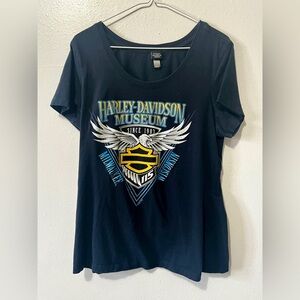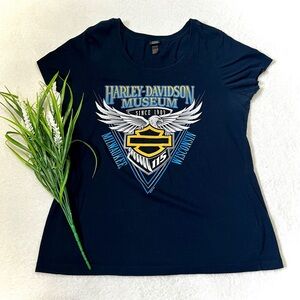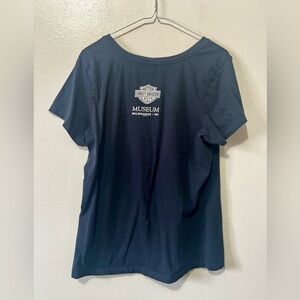 Harley Davidson Museum women's short sleeve graphic tee in a navy color with 'Harley Davidson Museum Since 1903, Milwaukee Wisconsion' slogan on front and small brand logo on back of top, scoop rounded neckline, tighter/form fitting, 2017 year. Fabric tag has been removed.