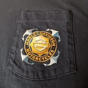 This Harley Davidson t-shirt in size L is perfect for any motorcycle enthusiast. With a black color and solid pattern, it features a crew neckline and short sleeves. The shirt has a skull on the beach theme.