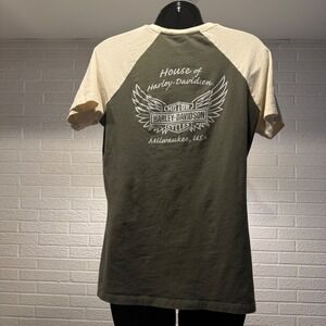 Keywords: Harley Davidson, T-shirt, Raglan, Graphic Tee, Women's, Olive Green, Cream, Motorcycle, Biker, Casual, Milwaukee, House of Harley Davidson, Short Sleeve, Top