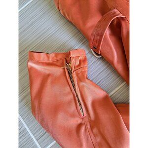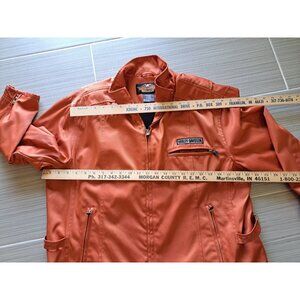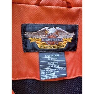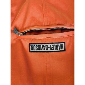 The Harley Davidson Orange Cotton/Nylon Women's Motorcycle Jacket #98146-03VW in size 2XL is a stylish and protective outerwear designed for women riders. Made from a durable cotton/nylon blend, this jacket features the iconic Harley-Davidson brand, vibrant orange color, and a motorcycle-themed design. Perfect for motorcycle enthusiasts who want to combine fashion with functionality, this jacket is a must-have for any Harley-Davidson fan looking for a comfortable and high-quality wardrobe piece. Please note as pictured small hole at inside cuff. Few very faint discolorations. Pull tabs broken in half but still usable