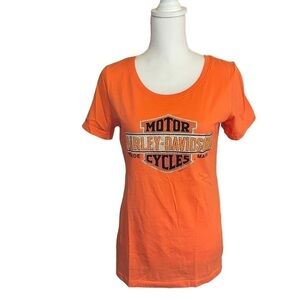 Harley Davidson Orange Short Sleeve Crew Neck T-shirt With Rhinestone Logo. Size Medium