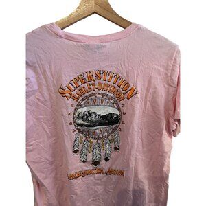 A stylish, pink short sleeve Harley Davidson t-shirt, perfect for any motorcycle enthusiast. This women's size large tee features a unique Arizona design, making it a standout piece in any wardrobe.