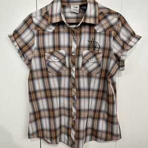 Harley Davidson 110th Anniversary Brown/Black/Rust/White Plaid Shirt. Women's Medium. Embroidered front and back. Western Cut, Pearl Snap, 100% cotton. Front pockets with snap flaps. Cuffed short sleeve. Shirttail hem, front and back yoke. Armpit to armpit measures 19.5 inches. Shoulder to hem is 24 inches. Smoke and pet free environment.
