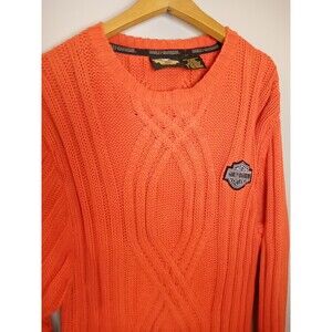 Add some unique style to your wardrobe with this vintage Harley-Davidson pullover sweater. The heavy cable-knit design in a bold orange color is perfect for any biker or USA-themed event. This sweater features a crew neck, long sleeves, and the iconic Harley-Davidson logo on the front.