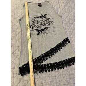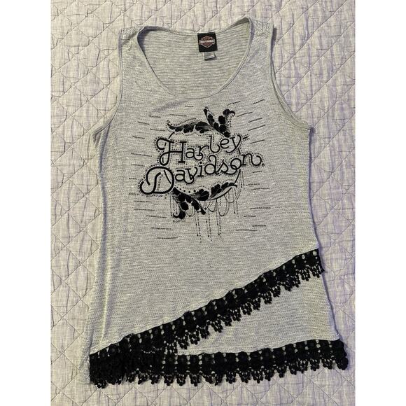 Harley Davidson Rhinestone Lace Hem Tank Top Womens Large Gray Tiered Biker Chic