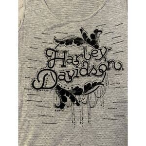 Harley-Davidson women’s tank top featuring a rhinestone logo design, velvet graphic accents, and an asymmetrical lace hem. Soft stretch knit fabric in heather gray.