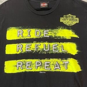 Keywords: Harley Davidson shirt, Motorcycle t shirt, Ride Refuel Repeat, Lake of the Ozarks, Osage Beach, Biker tee, Mens t shirt, Graphic tee, Vintage Harley Davidson, R.K. Stratman, St. Louis, MO, Black t shirt, Printed t shirt, Road trip shirt