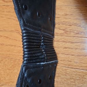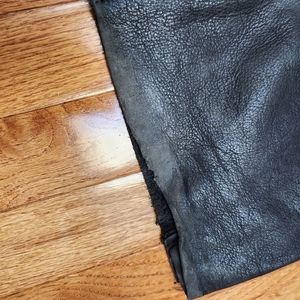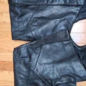 Black leather Harley Davidson riding chaps. Side zip and snaps. Adjustable belt. Leather elastic stretch in back waist and inner thigh. Lined with black Harley lining. Notice areas of wear at hems and one area on calf. Size S. Please check measurements. These were worn by a man but I'd say they are unisex. First measurement is just leg, second is from top to hem.