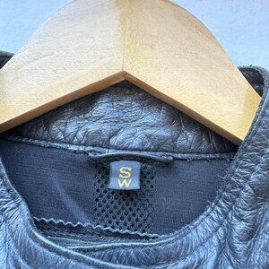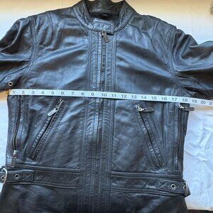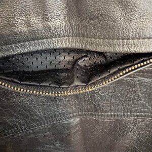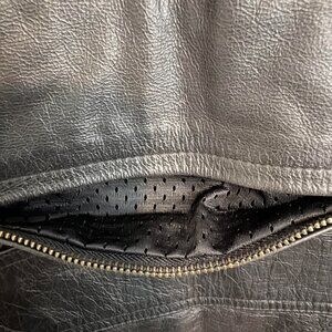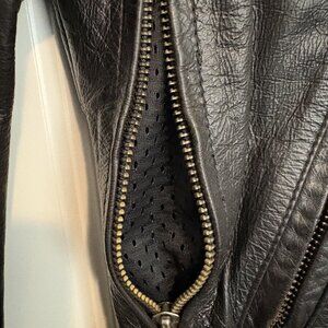 This is a very nice jacket – would have kept it for myself if I was a small. This jacket has zippered air vents in the side and back, and by the wrist. The interior lining is mesh. The waist is adjustable with the attached belts. The Harley log is embossed on the bad. This jacket is in excellent condition, no signs of wear or tear. This jacket does NOT come with any armor, padding.
