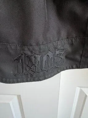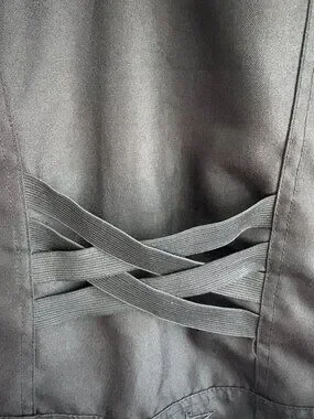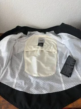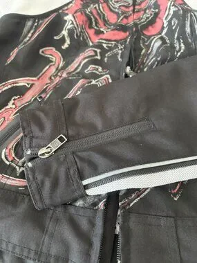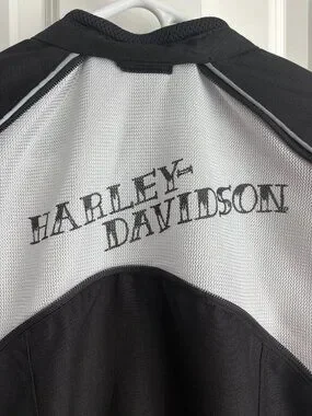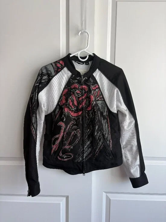 Harley Davidson Switch Back riding Jacket. Please note, this jacket is the jacket part only with no ”switchback” panels. The mesh that would be covered by the Panels, is down the front, down the sleeves, and across the back. The mesh is in excellent condition, no holes or tears. The side straps for tightening as are the corset straps in the back. The Harley Davidson applique on the back mesh panel is not embroidered but also in excellent condition. The front is a rose applique.