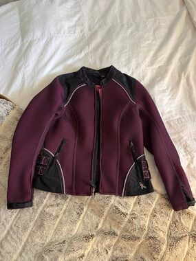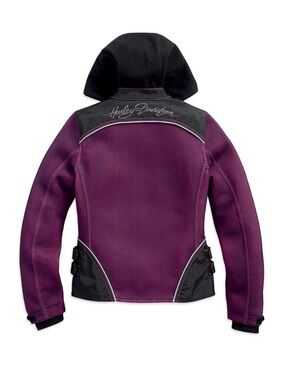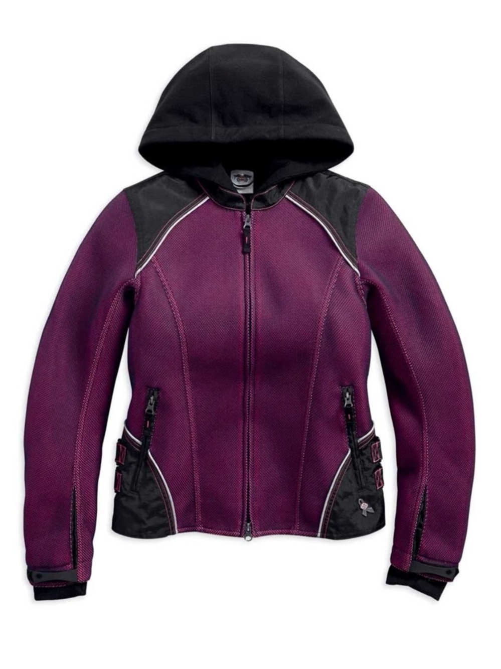 Harley-Davidson® Women's Pink Label 3-IN-1 Mesh Riding Jacket, 98319-17VW. Made of 100% polyester sandwich mesh features layers of pink and black mesh for a unique appearance. Polyester mesh body and sleeve lining. Removable microfleece full-sleeve windproof hoodie for extra warmth can be worn separately. Body armor pockets at elbows, shoulders, and back. Slightly pre-curved sleeves, double adjustable waist tabs, and one zipper vertical interior pocket. Contrasting panels and stitching on waist, collar, and front/back yokes with 3M® Scotchlite® Reflective Material piping. Pink Label medallion on front left hem and embroidered graphics on back yoke. Windproof removable hoodie features drawstring hood, extended rib-knit inset cuffs with thumbholes, kangaroo-style pockets, Pink Label medallion on right cuff, and embroidered graphics on back. 98319-17VW