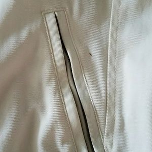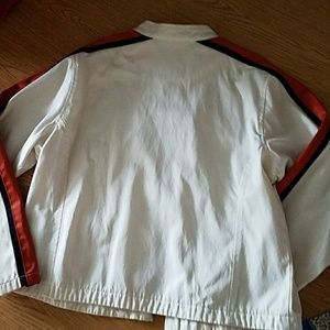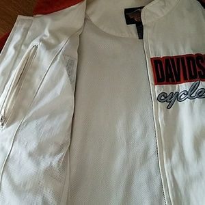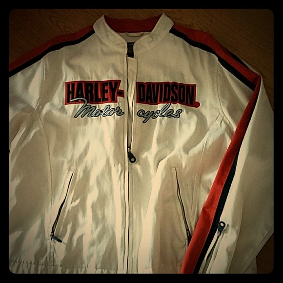 White Harley riding jacket with orange and black trim. Harley logo embroidered on the front. Worn several times & shows minor wear (see photos). Body is 59% cotton & 41% nylon with a nice polyester lining. Great and stylish jacket, perfect for those chilly late summer and fall evening rides! Will consider reasonable offers.
