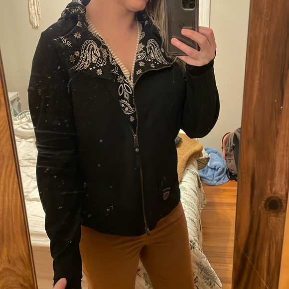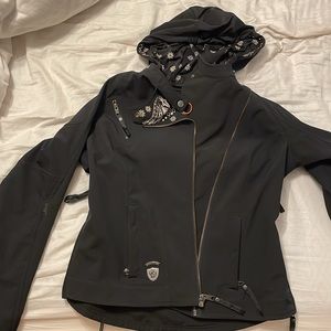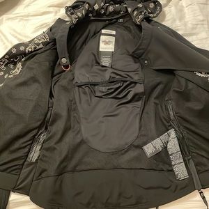 Practically new Harley Davidson riding jacket. Super cute paisley design. This coat is a Large Tall! Has thicker protective material over shoulders and elbows. Also has concealed carry pocket in back panel.