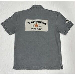 This Harley Davidson shirt for men in size M features a solid gray color with a short sleeve and button-up closure. Made of cotton, it is machine washable and has a regular fit. The shirt is adorned with embroidered accents and a button-down collar, perfect for a casual or travel occasion. With a biker and motorcycle theme, this shirt is a stylish and comfortable addition to any wardrobe.