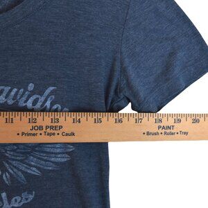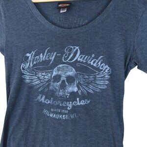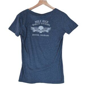 This Harley-Davidson tee brings classic biker grit with vintage appeal. The faded skull and wings graphic adds a rebellious touch, featuring iconic Harley script from Milwaukee, WI on the front and Mile High Denver branding on the back. Soft worn-in feel, flattering women's small fit with a scoop neck and short sleeves.