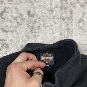 This Harley Davidson sweater from Kewanee, IL is a size Small full zip jacket with long sleeves and logo accents on the front. It features a solid black color and a crew neck neckline, making it suitable for casual occasions. This sweater is machine washable and has a regular fit, perfect for the winter, fall, and spring seasons. With its 80s and 90s theme, this Harley-Davidson sweater is a stylish addition to any man's wardrobe, embodying the classic biker aesthetic.
