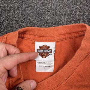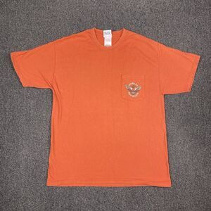 This Harley Davidson T-Shirt in Osage Beach, MO, featuring a graphic print of the Lake of the Ozarks, is a must-have for any biker or motorcycle enthusiast. Made from comfortable cotton with a crew neck and short sleeves, this regular fit shirt is suitable for all seasons and is double-sided for added style. The vibrant orange color and iconic Harley-Davidson brand make it a perfect addition to any wardrobe, showcasing a beach and biker theme that is sure to make a statement.