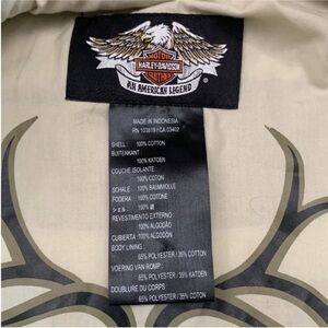 Harley Davidson Tan Canvas Asymmetrical Full Zip Embroidered Worker Jacket Size XS. Good worn condition. Slightly Cropped. Fully lined. Full zip with four front button flap pockets.