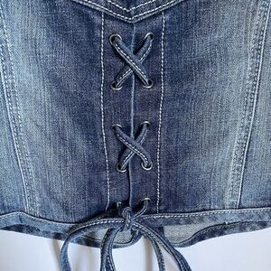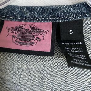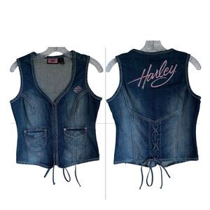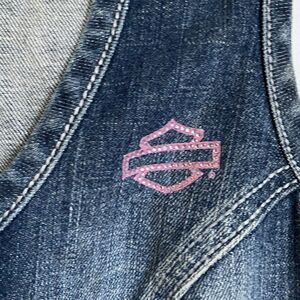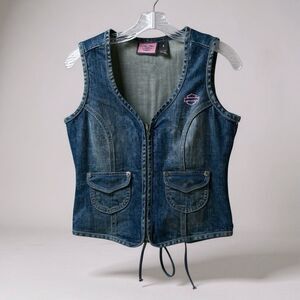 Harley Davidson Vest Jean S Blue Zip Up Embroidered Rhinestones Tie Back. Excellent pre-owned condition.