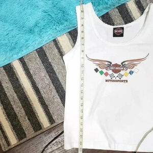 Harley Davidson Vintage Motorsports. Tank Size Large. 2001 vintage tank. Excellent vintage condition. Does have a really faint stain on the front as shown in photos. No size tag but measurements are posted