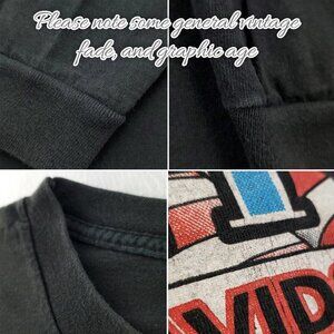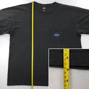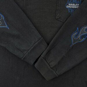 Harley-Davidson Motorcycles vintage 1996 single stitch made in USA long sleeve t-shirt with blue flames on sleeves and pocket, men's size 3XL. Please note average overall fade and mild graphic distressing. Featured dealership is Whitt's in Manassas, Virginia (patriotic flag back hit graphic). I've included measurements, so you will know if this properly fits you. Ships safely in secure box :)