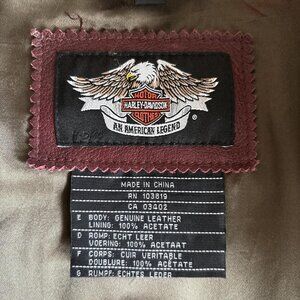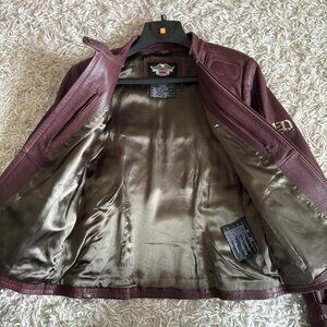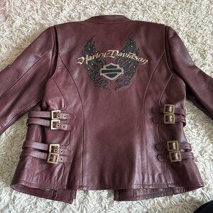 Burgundy leather Harley Davidson jacket with zipper and buckle details