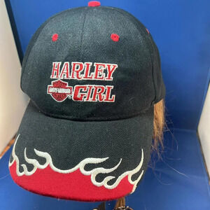 Ride in style with this authentic Harley Davidson cap designed especially for the Harley Girl. This cap showcases a striking black and red color scheme, featuring a bold 'HARLEY GIRL' logo and unique flame detailing on the brim. Perfect for motorcycle enthusiasts or anyone wanting to make a statement, this cap is both fashionable and practical.