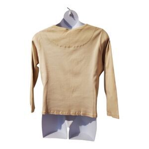 This is a Harley-Davidson women's long sleeve shirt in tan, size 1W. The shirt features a solid design with a round neckline and embroidered accents. Made of 100% cotton, it has a regular fit and is a pull-over style. The shirt is branded by Harley-Davidson and has a biker and motorcycle theme.