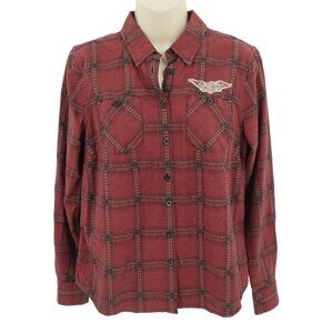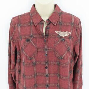 Harley Davidson Womens Petite Small PS Red Plaid Button Front Shirt Top Blouse