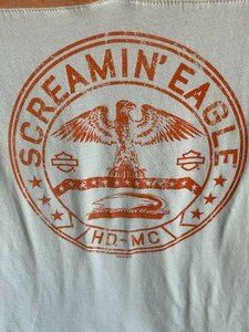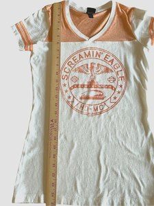 Harley Davidson Womens Short Sleeve TShirt SZ Small Orange White Screamin Eagle.This Harley Davidson women's short sleeve tshirt has a baseball raglan type sleeve with graphic Screamin Eagle. It is orange or peach and white.It is a cotton polyester blend. This pre-owned shirt is in good condition with no stains or tears. See pictures for style, condition and size. May be vintage but was not sure.