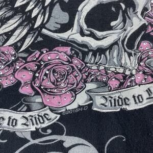 Black shirt with front design featuring skull, wings, roses, and “Ride to Live / Live to Ride” banner. Embellished with rhinestones for extra detail. Back features Harley-Davidson of The Woodlands, TX dealer graphic.