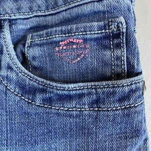 Harley Davidson Women's Sz 14 Jeans Pink Embellished Pockets Denim Straight Leg There are some missing pink rhinestones small spot on back of leg has not been treated