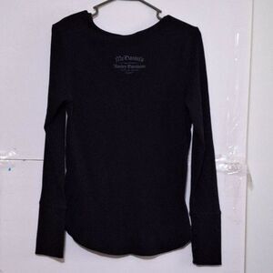 This Official Harley Davidson women's top is in very good pre-owned condition with a graphic down the left side that says Genuine Harley Davidson. This has a rounded neckline, long sleeves, and a curved hemline. The material tag is too faded to read. 21" from pit to pit and 28" from shoulder to hem.