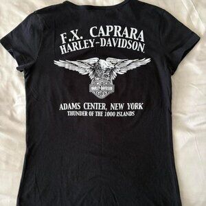 Harley Davidson black tee. Adam's Center NY. No size. Measurements in photos. Looks to be a women's Med. Thanks for looking!! #harley #motorcycles #bikerchic