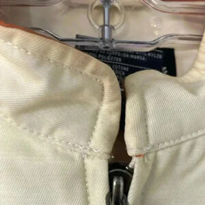 Harley Davidson cream embroidered spell out jacket , color orange, black, cream , has light yellowing marks as shown I. Pictures with a couple marks not noticeable on, sizeM, otherwise good condition