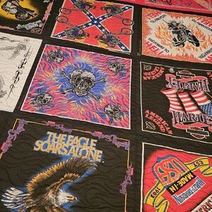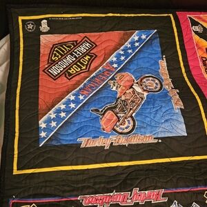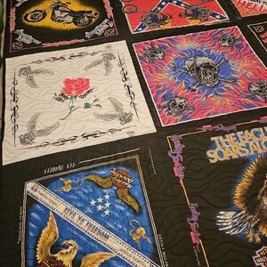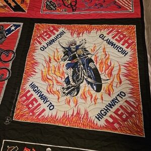 This is a handmade quilt featuring an original design made from Harley Davidson bandanas. The quilt measures 61x80 inches. Has hellfire stitched backing, this is a one of a kind item like no other. Hand picked bandanas specifically sourced for this piece.