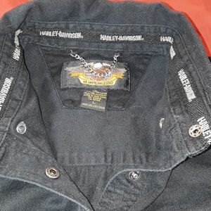 This is A black button down shirt with 7 shiny silver buttons going down the shirt and 2 silver buttons on each cuff. This shirt is A size Large for women and its 27" inches from the shoulder to bottom of jacketand its 21" inches from arm pit to pi shiry is 100% Cotton and in excellent condition.