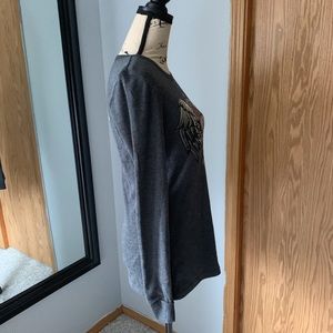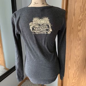 Dark grey with red and cream in front detail. Waffle fabric with Modesto, Ca on back. Super comfortable, size small. Thanks for looking!