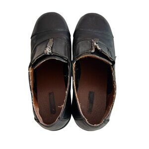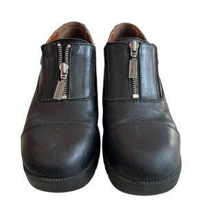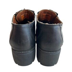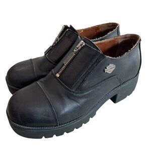 Harley-Davidson motorcycle shoes, black leather, zipper detail, round cap toe, chunky soles with a slight platform, 2" block heel, US women's 9, preowned and shows wear on the soles, scuffing/creasing on the exterior, cracked/flaking lining - see photos