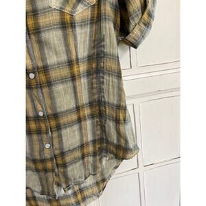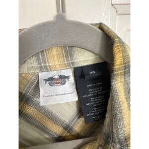 Harley Davidson size XS plaid snap down shirt in great condition. Made to look a bit worn. Mustard yellow, beige and black. Some beading detail on the pockets. Measures 19” from pit to pit and 25” long.