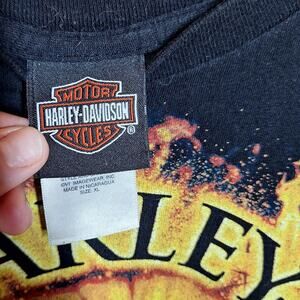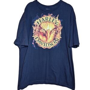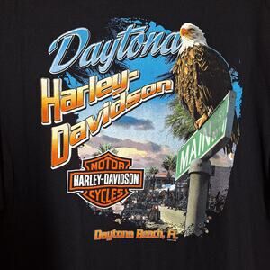 in very good condition Y2K 2014 vintage harley davidson motorcycles daytona beach florida location front and back double sided graphic print tee mens size XL super cool black with eagle landscape scene on back and flaming eagle portrait on front