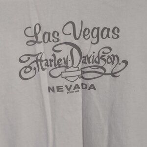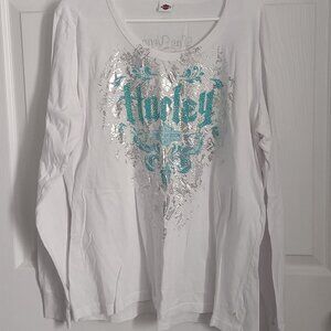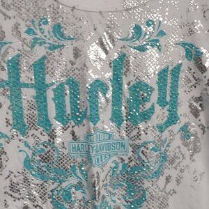 White long sleeve Harley Davidson with BLING. Purchased at the Harley Davidson in Las Vegas. Size 1XL . No size tag on the inside, I cut it out. Does have a small hole in the lower front left. See last photo. Other than small whole in excellent shape. All rhinestones in place. Only wore once.